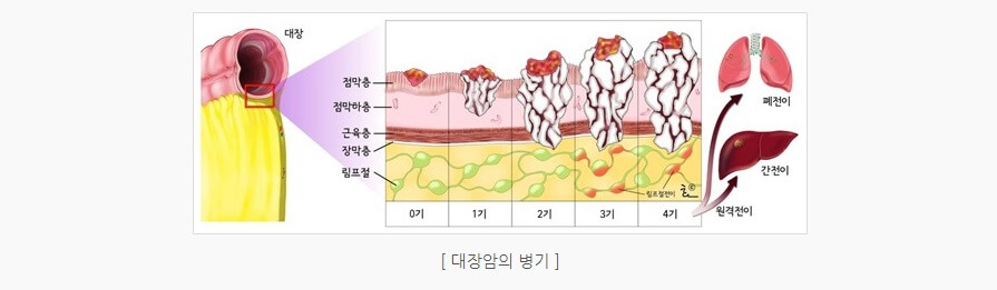 대장암의 대부분은 용종에서 기원합니다. 용종은 대장의 가장 안쪽 층(장 안에서 보면 표면층)인 점막에서부터 시작되어서 점점 커지게 되고, 그중 일부가 암으로 변하며, 그 이후에 대장벽으로 침윤해서 들어갑니다. 장벽 침육 정도, 주위 림프절 전이 정도, 그리고 복만이나 간, 폐 등 다른 장기로의 전이 여부들을 종합하여 병기를 1기에서 4기로 나누게 됩니다.