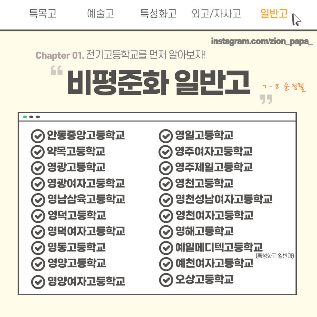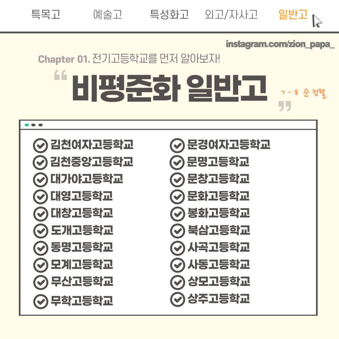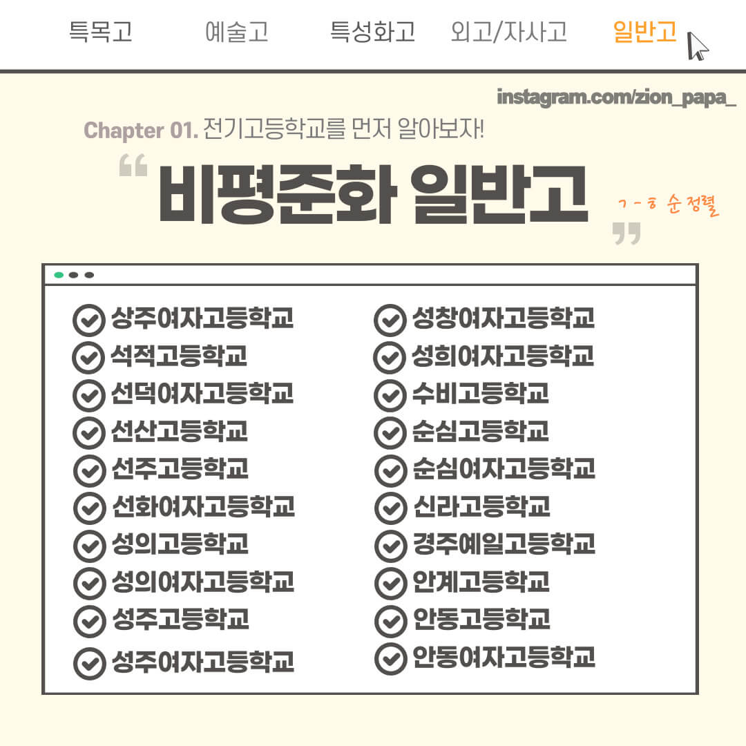 고입 미리 준비하시라고 경북 고등학교 전체 가져왔습니다. 특목고, 예술고, 외고, 일반고 등으로 분류하였으니