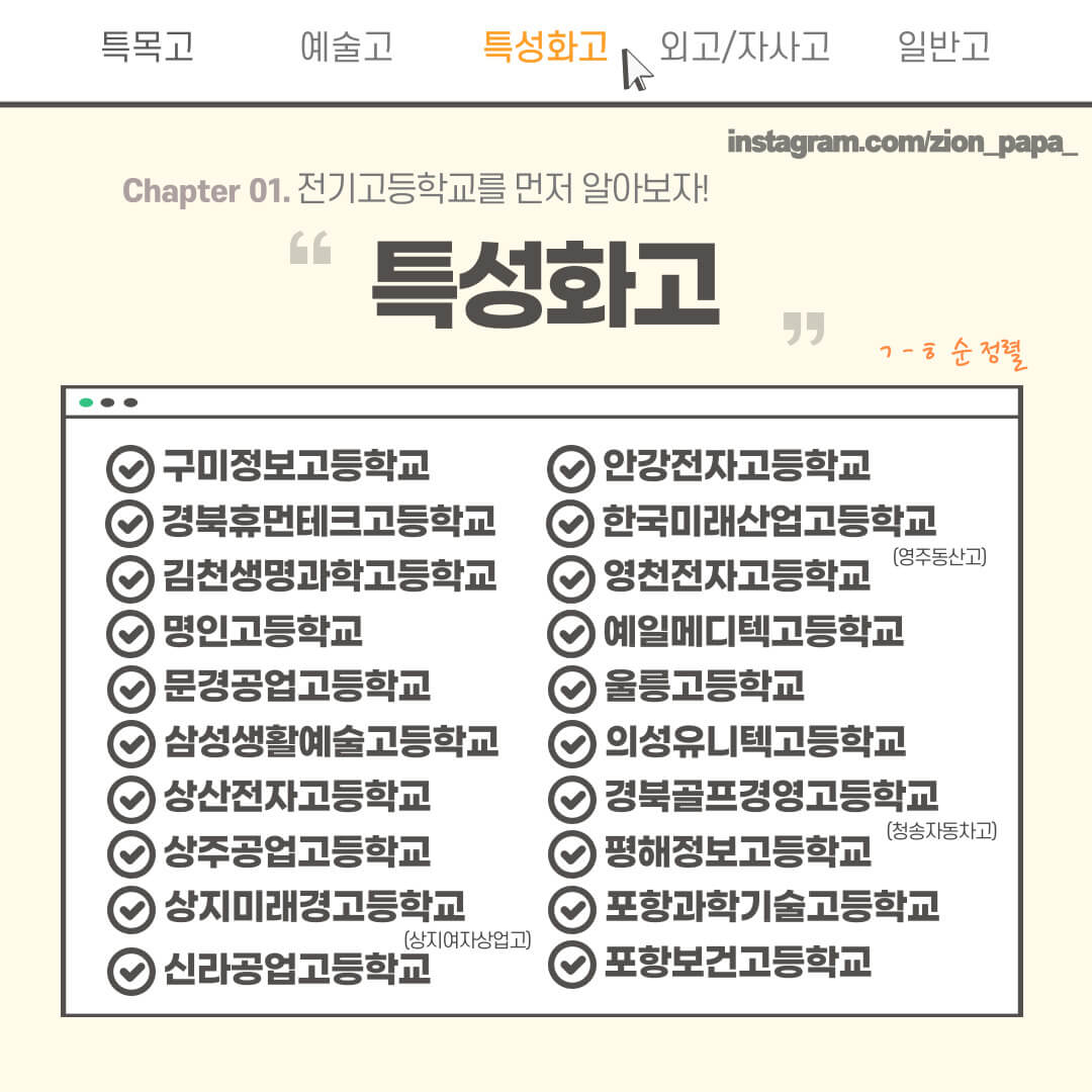 전기고등학교에는 특목고와 일반고(예술), 특성화고가 포함되어 있습니다.